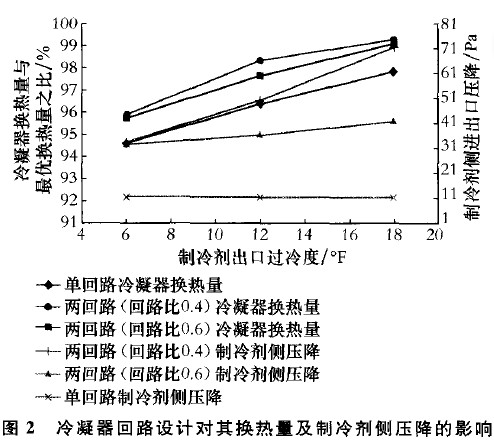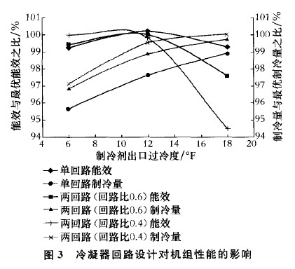 模擬結(jié)果表明,該機(jī)組冷凝器的較優(yōu)設(shè)計方案為回路比為0.4的兩回路,過冷度優(yōu)化在10~ 12。F。以上各種回路的設(shè)計方案對系統(tǒng)的制冷量及能效的影響在2 -5 范圍內(nèi)。