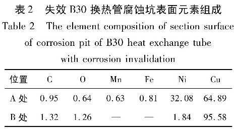 腐蝕坑表面外圍(A處)和底部(B處)的SEM及EDS結(jié)果如圖7和表2所示,可見(jiàn),在蝕坑外,Ni元素含量32.08%(ω),Cu元素含量為64.89%(ω),材料成分符合B30合金特征;在蝕坑內(nèi),Ni元素的較低含量?jī)H1.84%,遠(yuǎn)低于B30合金的Ni含量。