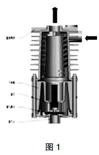 如圖(1)所示,由空壓機(jī)輸出的壓縮空氣經(jīng)進(jìn)氣口進(jìn)入散熱閥體與內(nèi)腔之間的螺旋通道,溫度下降,產(chǎn)生冷凝,在分離區(qū)使壓縮空氣中的水、油分離。通過桿狀濾芯,進(jìn)入排放通道。打開排氣膜片,油水被收集在集液腔。